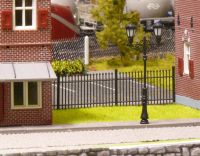 Een hekwerk tussen twee huizen geeft ruimte voor een mooi gazon. Daarachter liggen parkeerplaatsen. |